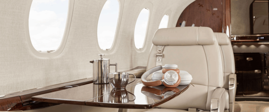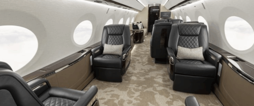 - Customizable Living Zones: Newer large-cabin jets are designed with multiple, distinct living zones, allowing for private suites, dedicated conference areas, and lounges. On a jet like the Dassault Falcon 10X, passengers can even find a full-sized queen bed and a shower.